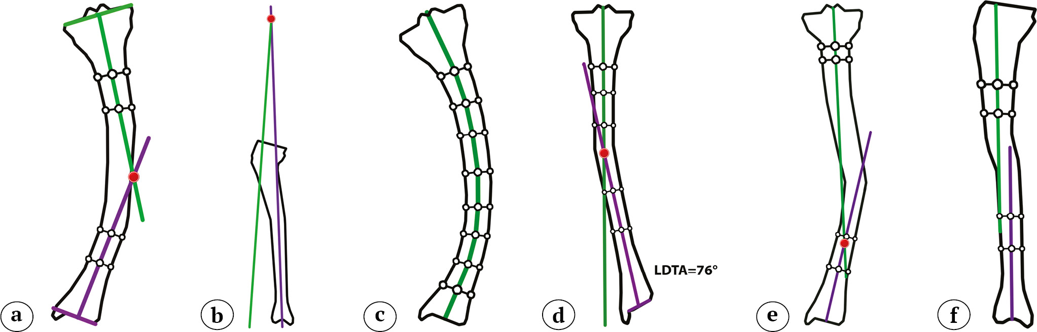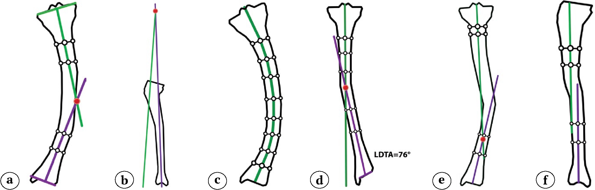 Fig. 1. Diagnostic signs of MD (using the tibia as an example): a — AOD is located outside of the bone (laterally); b — AOD is located outside of the bone (proximally); c — the bone has a long, curving bow; d — the bone segment has an obvious deformity plus the LDTA formed by the mid-diaphyseal line is abnormal; e — AOD doesn’t match the obvious deformity; f — the proximal and distal axes are parallel