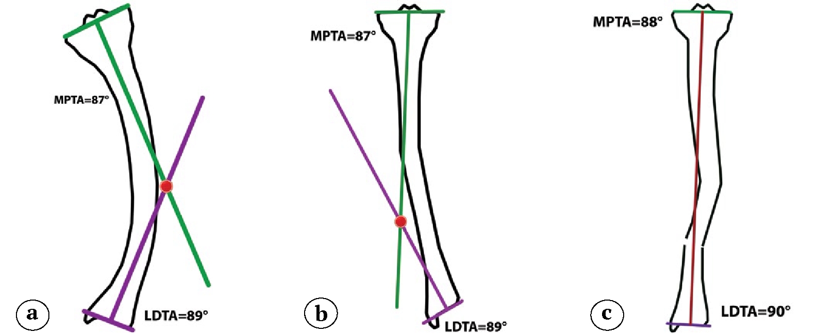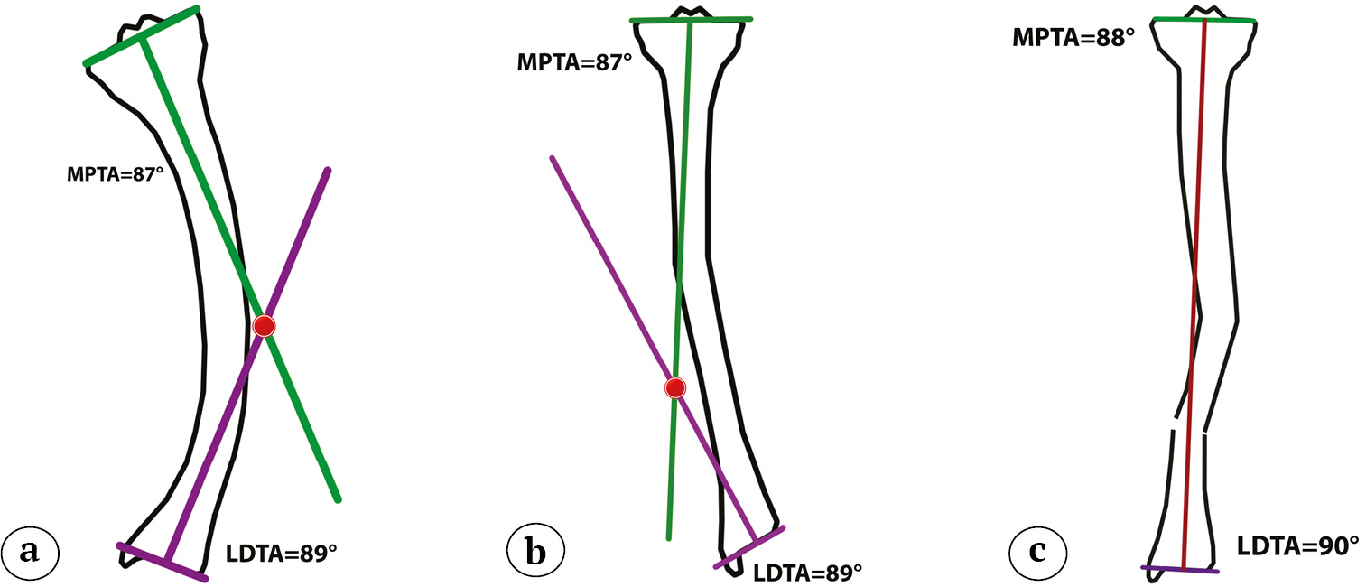 The majority of authors agree that the axis of the intermediate fragment is the mid-diaphyseal line [8, 12, 13, 17, 21, 29, 34]. However, in D. Paley's study, an alternative position is presented, suggesting that the axis of the intermediate fragment “can be drawn at different orientations” [9] (Fig. 2). Based on the illustration provided in his article, it can be assumed that any position and angle of inclination of the axis of the intermediate segment are permissible as long as it intersects with the axes of the proximal and distal segments of the bone and does not extend beyond the bone's boundaries.