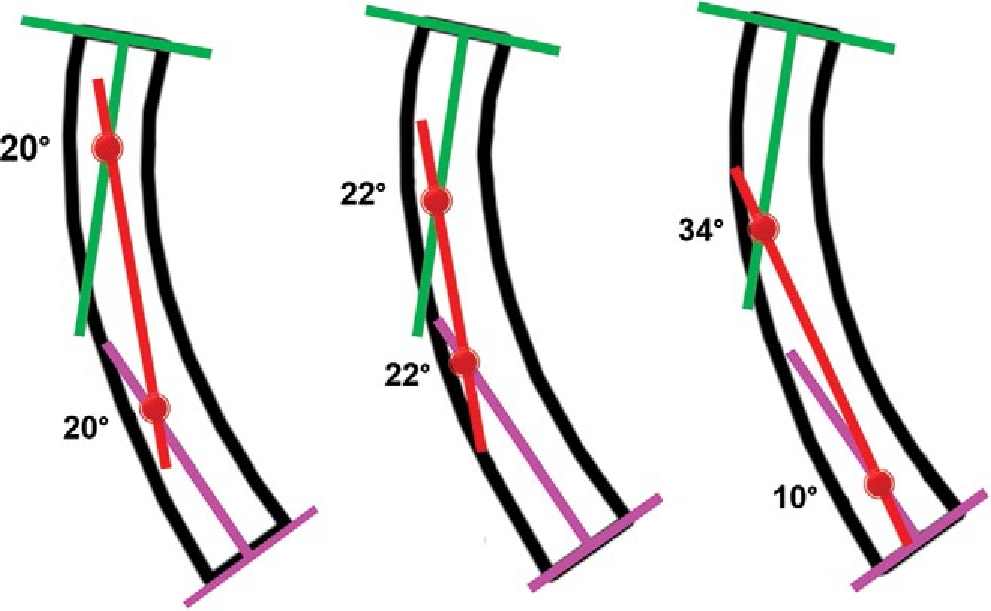 The diagnosis of MD (multiapical deformity) deserves separate consideration. Signs referred to as "bow curving bone "and"deviation of one of the angles from the reference values when crossing anatomical axes in the area of "obvious deformity" are illustrated in Fig. 1 c and 1 d. However, when determining the MD using mechanical axes in both cases, the point of intersection is located outside the bone (Fig. 3 a, b). Thus, the discussed signs are not independent but rather specific cases of feature No. 1, which is "location of the MD outside the boundaries of the bone."