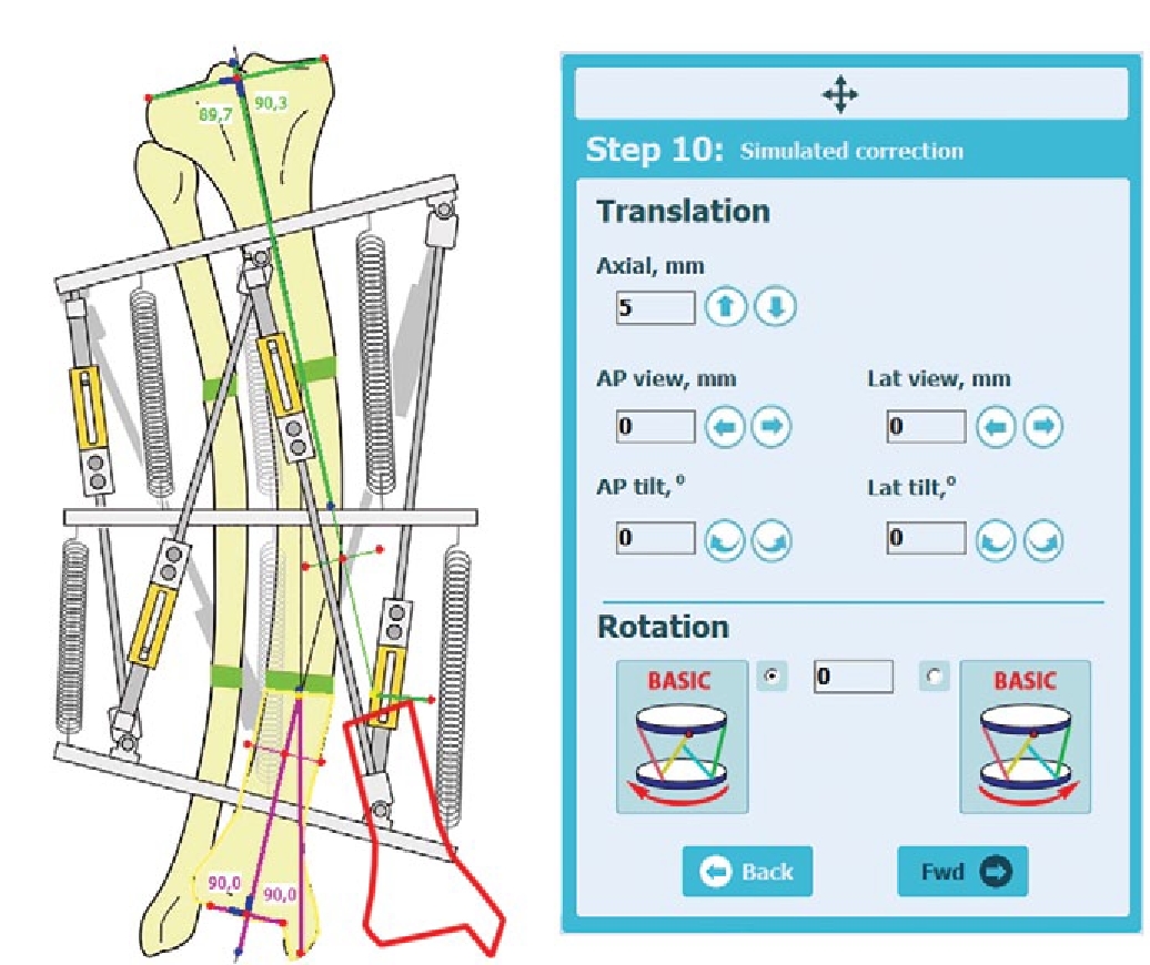 In the implementation of the "spring technique," the first stage of correction (distraction) is performed using the orthopedic hexapod at one apex and two-plane Ilizarov hinges at another apex. When performing the standard calculation in the computer program to achieve distraction, axes of the proximal and distal (mobile) fragments are required. Based on this, the algorithm built into the program aligns the distal fragment's axis with the proximal one. Therefore, in cases where one axis is not an extension of the other, meaning there is angular deformity, the distal fragment will experience displacement in width and/or at an angle (Fig.4).