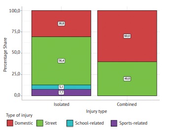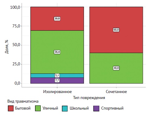 Cases of attempted suicide among children and adolescents were categorized as domestic injuries. Statistical analysis revealed a significant difference between patients with isolated and combined injuries (p = 0.019) — domestic injuries, primarily suicide attempts (self-inflicted injuries), were more prevalent among patients with combined injuries.