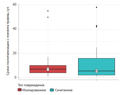 Fig. 2. Analysis of the terms of hospitalization from the moment of injury, depending on the type of injury