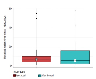 The average time between trauma and admission to the Center was 10.3 days (min 1, max 58; Q1–Q3 = 2–12). Out of the 78 patients, 42 (54.4%) were medically evacuated by local medical organizations. For the remaining 36 patients (45.6%), transportation was organized by relatives, with the delivery distance exceeding 500 km in 23 cases. A comparative analysis of admission times to the Center between patients with isolated and combined injuries did not reveal significant differences (p = 0.976) (Figure 2). This could possibly indicate organizational factors that may override or outweigh clinical considerations.