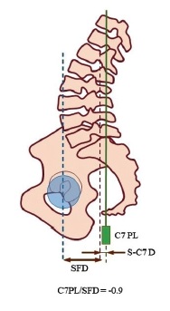Мультиспиральную компьютерную томографию (МСКТ) выполняли на спиральном 64-срезовом компьютерном томографе Somatom Definiton (Siemens). Важным критерием оценки сагиттального баланса является отношение линии отвеса С7 к крестцово-бедренному расстоянию (C7 plumb line/sacrofemoral distance — C7/SFD).