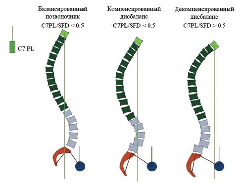 Этот индекс равен нулю в случае, если линия отвеса С7 проецируется точно на задний край верхней замыкательной пластинки S1 позвонка, и равен единице, когда линия отвеса С7 проецируется точно на вертикальную линию через головки бедренных костей. В нормальной здоровой популяции его среднее значение составляет -0,9±1,0. Его значение является отрицательным, когда линия отвеса С7 проецируется кзади от крестца, а в случаях, когда линия отвеса С7 проецируется кпереди от головок бедренных костей, его значение превышает единицу. IB более точно отражает состояние глобального сагиттального баланса по сравнению с SVA, поскольку обеспечивает возможность учета переднезаднего размера таза, который меняется в зависимости от значения PI и имеющихся компенсаторных механизмов. В соответствии со степенью выраженности сагиттального дисбаланса выделяют три типа сагиттального профиля позвоночника: балансированный позвоночник (I тип), компенсированный дисбаланс (II тип) и декомпенсированный дисбаланс (III тип) (рис. 2) [15].