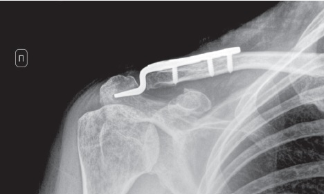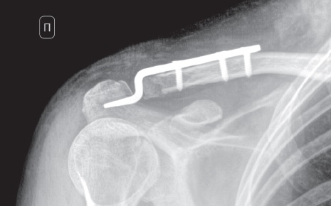Conclusion. Presented clinical case illustrates successful treatment result of this type of fractures without fixation of the coracoid process fracture. The hook plating allows to stabilize bone fragments and restore ligament tension, which makes this implant non-alternative for fixation of this type of injuries.