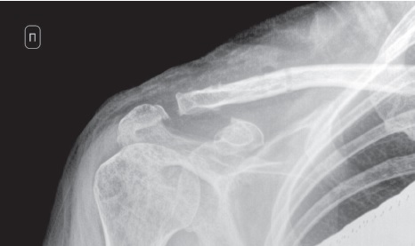 Fig. 1. X-ray of the right acromioclavicular (AC) joint in AP view. Signs of closed fracture of the right distal clavicle with displacement of fragments combined with coracoid process fracture