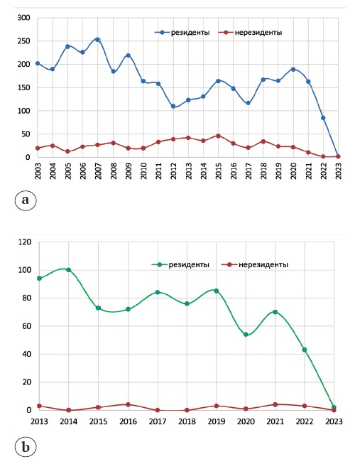 Рис. 1. Динамика патентования в области ортопедии и травматологии в Российской Федерации (данные за 2023 г. даны за 5 мес.): а — изобретений; b — полезных моделей