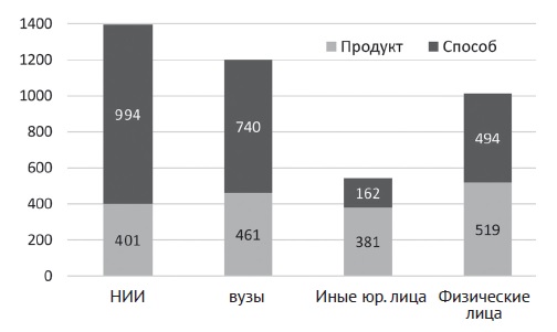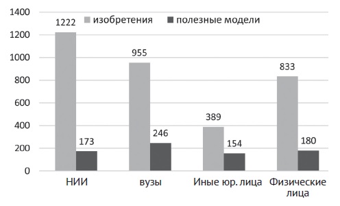 Рис. 2. Активность патентования изобретений за 20 лет и полезных моделей за 10 лет различными категориями патентообладателей
