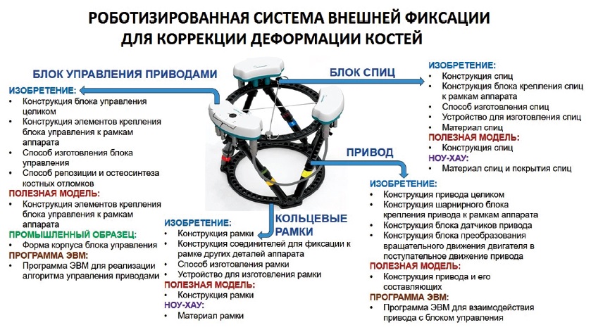 Рис. 4. Варианты объектов, на которые можно получить правовую охрану, на примере роботизированной системы внешней фиксации для коррекции деформации костей [6]