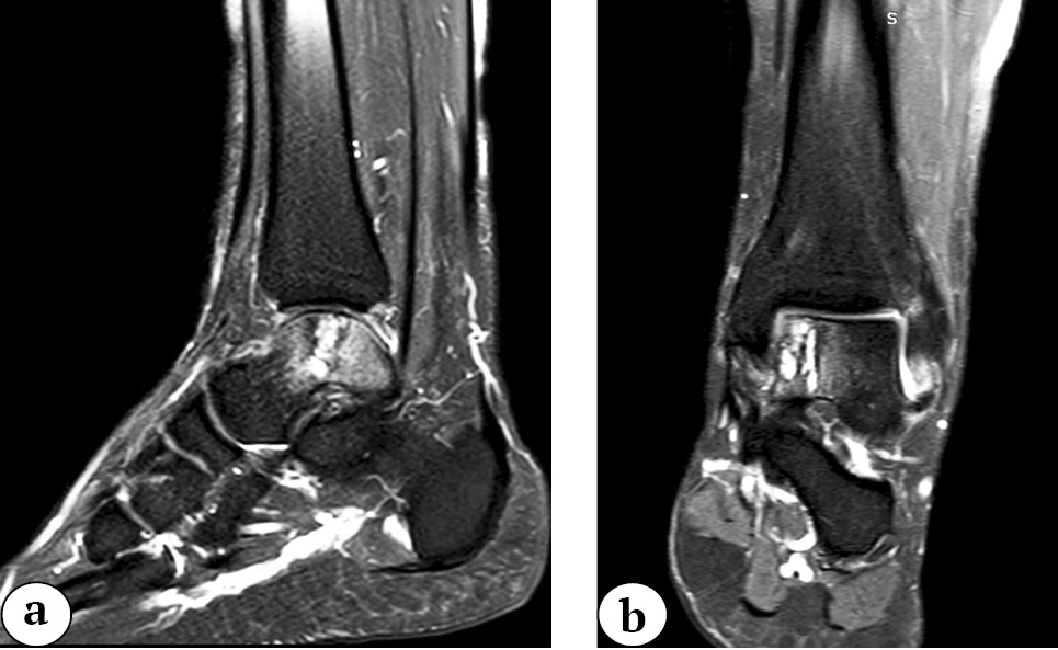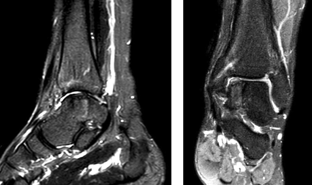 Fig. 1. MRI of the left ankle, multiplanar reconstruction (T2-weighted image): a — frontal plane; b — sagittal plane