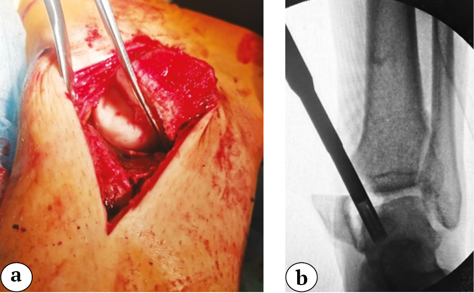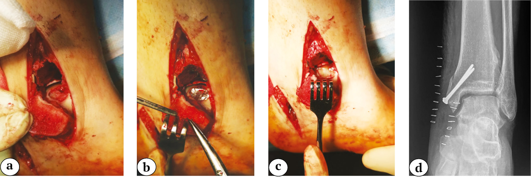 Fig. 3. Replacement of the bone defect with a autograft: a — view of the autograft placed in the osteochondral defect; b — after filling the defect, a sterile foil is shaped according to the size of the osteochondral defect; c — a collagen membrane is placed in the osteochondral defect after applying a fibrin adhesive gel; d — radiographic control of the ankle joint after fixing the medial malleolus with screws