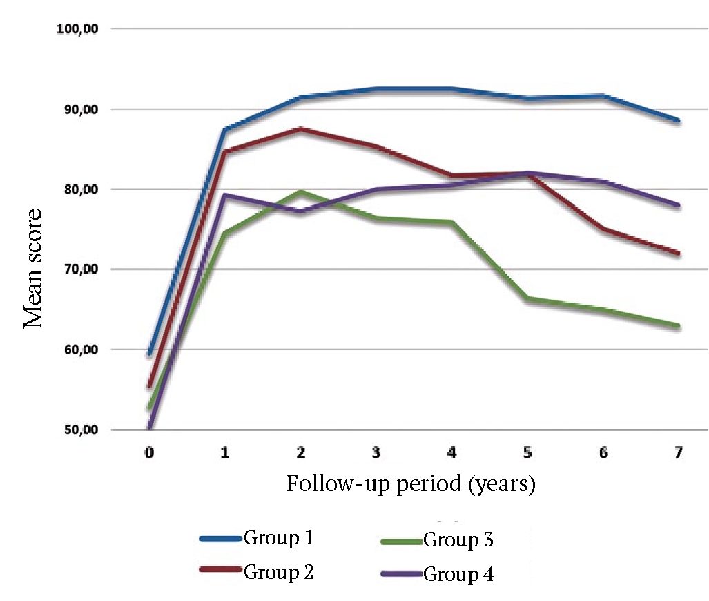 All the patient groups showed a significant improvement in sports activity in the first years after surgery, but after 2 years, there was a tendency for its decrease in the patients of groups 2 and 3. The dynamics of changes in the results of treatment of patients with FAI based on the data of the HOS-Sport subscale in the average time from 1 to 7 years is presented in Figure 3.
