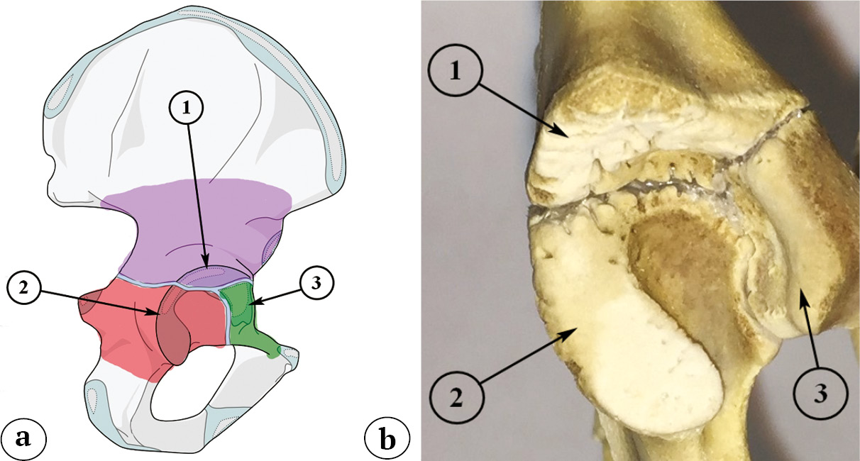 The Russian anatomical tradition is notably more consistent in defining the term «body» of the pubic bone from an embryogenic and anatomical proximity perspective to similar structures [9]. «The pelvic bone, os coxae, is paired, and in children, it consists of three separate bones: the ilium, ischium, and pubis. In adults, these three bones fuse into a single pelvic bone. The bodies of these bones, by joining together, form the acetabulum on the outer surface of the pelvic bone. The ilium represents the upper part of the acetabulum, the ischium the posterior-inferior part, and the pubic bone the anterior-inferior part. During development, each of these bones develops independent ossification centers, so that until the age of 16-17, in the region of the acetabulum, the ilium, ischium, and pubic bone are joined by a Y-shaped cartilage. Subsequently, the cartilage ossifies, and the boundaries between the bones smooth out» [10]. In other words, if these bones, through their parts, form a single anatomical structure (the acetabulum), then these parts should also be named uniformly—in this specific case, as the «bodies» of all three pelvic bones (Fig. 1).