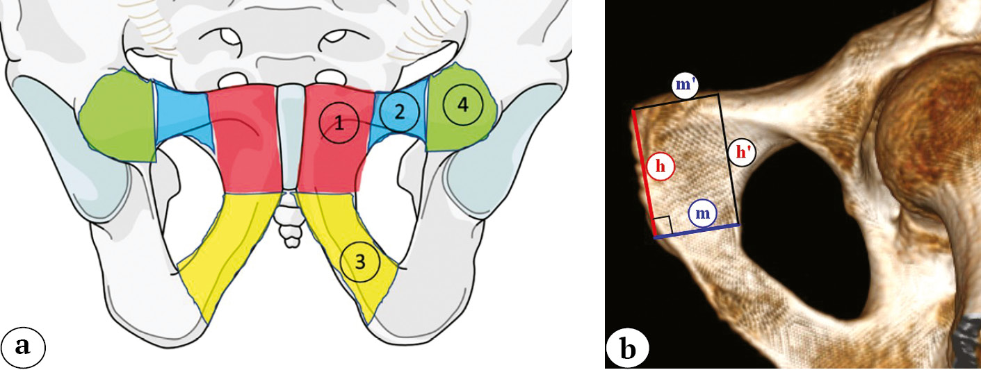 Fig. 2. Division of the pubic bone into four conventional regions: 1 — base, 2 — superior branch, 3 — inferior branch, 4 — body (a); conventional boundaries of the base of the pubic bone: h — height of the base (red color), m — width of the base (blue color). Black color indicates the remaining borders of the base h’and m’, which are the sides of the completed rectangle from the sides h and m (b)