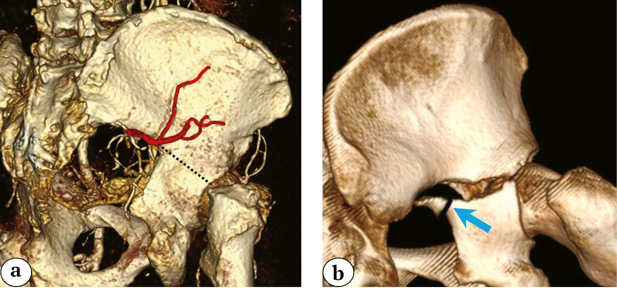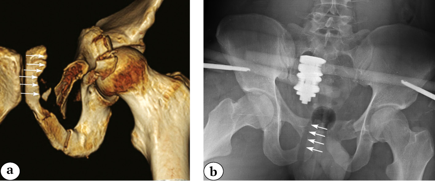 The clinical interest in this situation primarily arises from the intimate proximity of the relatively large superior gluteal artery and the sciatic nerve to the sharp end of the posterior column fracture (Fig. 14a). The artery and nerve can be damaged both directly during the trauma and iatrogenically when attempting to expose them during open reduction of the fracture. Intraoperative bleeding from the superior gluteal artery can pose an existential threat to the patient and requires careful preoperative preparation. Damage to the sciatic nerve can lead to neurological deficits, potentially resulting in impaired lower limb support function and significant pain syndrome.