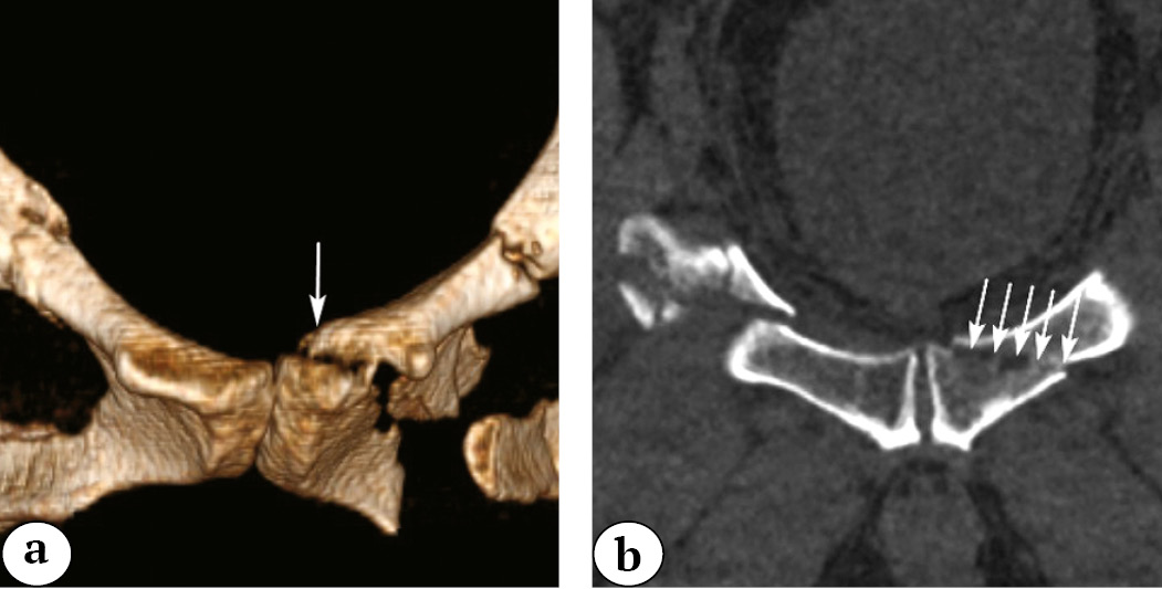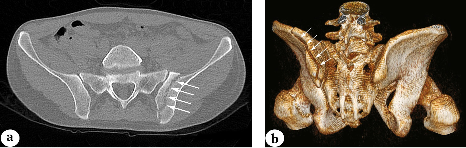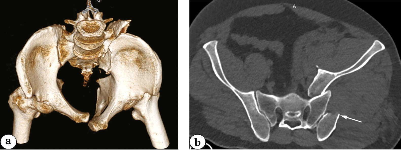 Fig. 9. 3D-CT image reconstruction of the pelvis in the inlet view (a); 2D-CT image reconstruction of the pelvis in the axial view. Displacement of the fragments in the SIJ is greater than 1 cm. The arrow shows the level of the fracture of the iliac base in relation to the CPS, type II according to A. Day ( b)