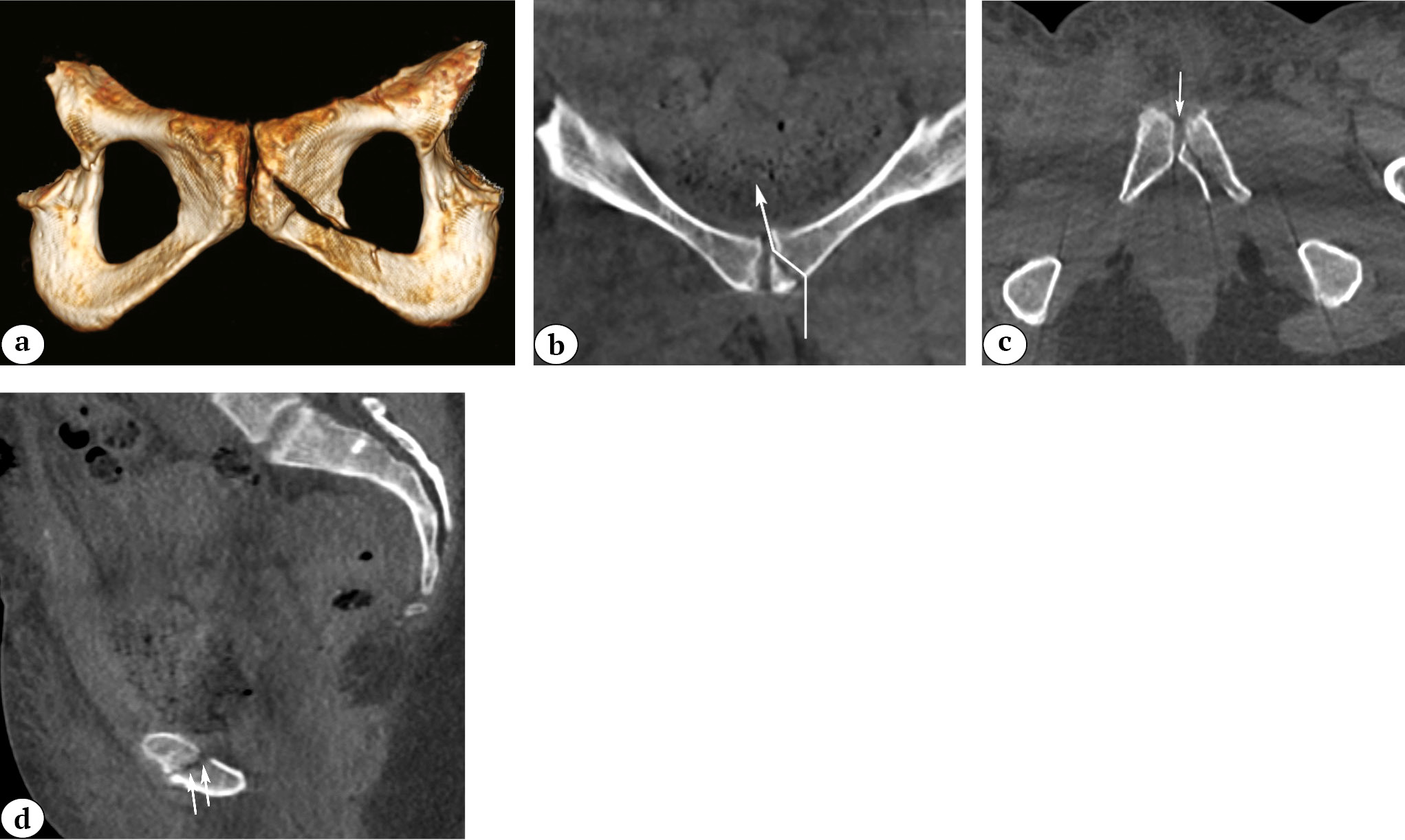 Fig. 5. Incomplete symphysis rupture with horizontal fracture of the pubic bone base: a — 3D-CT image reconstruction; b — 2D-CT image of incomplete symphysis rupture and the direction of the traumatic force; c — 2D-CT reconstruction, the arrow indicates symphysis gap widening; d — 2D-CT image reconstruction in the sagittal view of the pelvis, the arrows indicate the fracture line extending into the symphysis