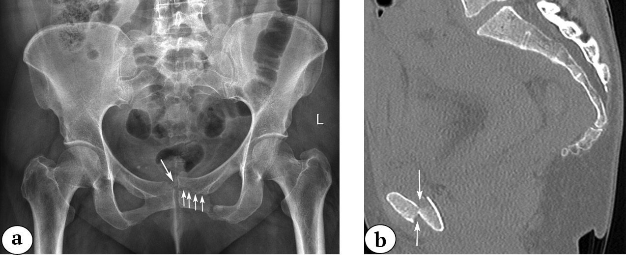 Fig. 6. Pelvis X-ray in the AP view. The arrows indicate the rupture of the superior ligament of the symphysis and partial widening of the symphysis, horizontal fracture of the base of the pubic bone (a); 2D-CT image reconstruction of the pelvis in the sagittal view. The arrows mark the displacement of the fragments (b)