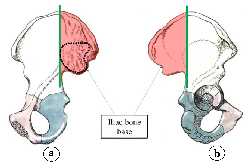 Fig. 7. Conditional localization of the iliac bone base (highlighted in red): a — internal view, the dotted line indicates the articular surface of the sacroiliac joint; b — outside view