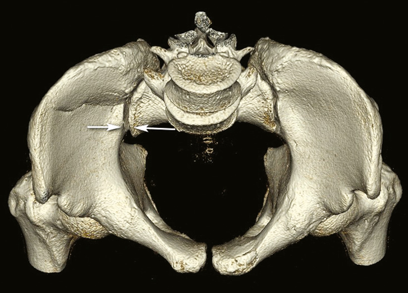Fig. 8. 3D-CT image reconstruction of the pelvis, the inlet view. The arrows indicate the opening of the SIJ gap less than 1 cm