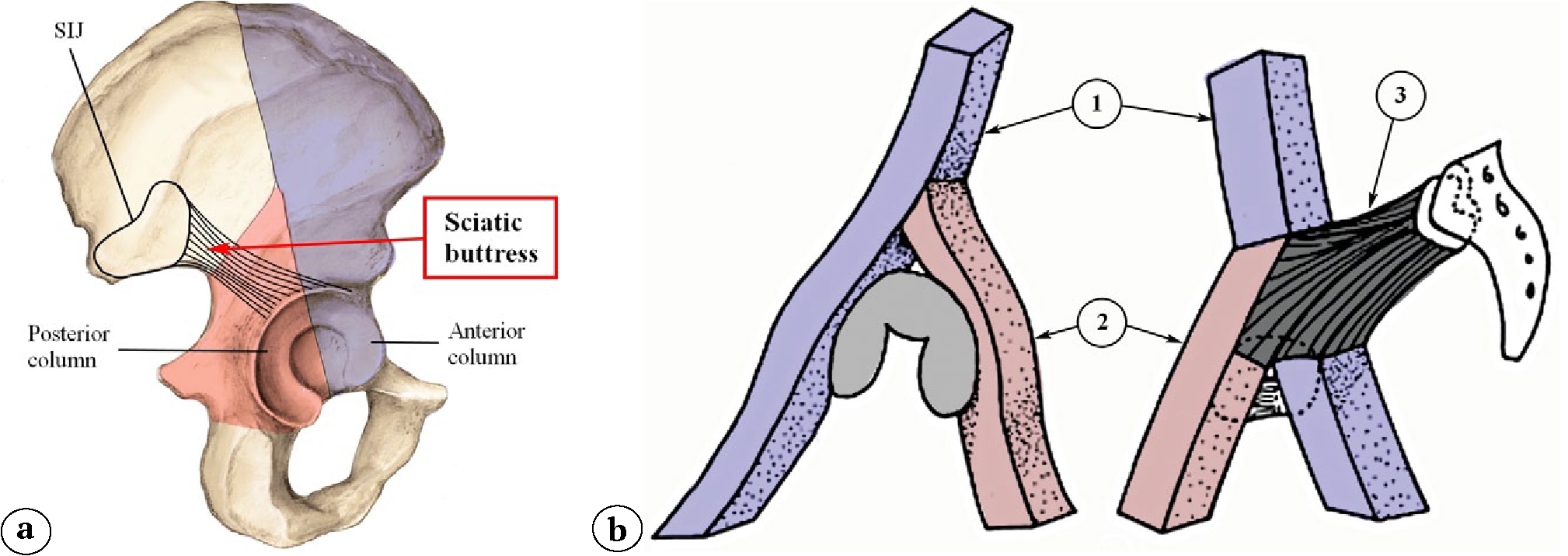 The founder of acetabular surgery, E. Letournel, developed a classification for its fractures based on the two-column concept [14, 15]. The area of dense cancellous bone that participates in transferring axial loads from both columns of the acetabulum to the sacrum is referred to as the “sciatic buttress” (Fig. 11).