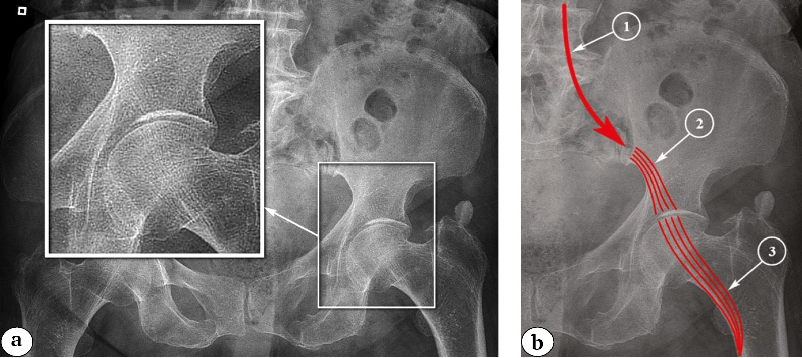In the absence of a direct Russian equivalent in domestic literature, the term counterfort would be conceptually close, although it is primarily used in the context of describing cranial bones, such as the frontal-nasal or zygomatic counterfort [16]. However, an equivalent term with a similar meaning that has been used in trauma literature is calcar (for example, “calcar of the femoral neck” or “calcar of the shoulder). Given that this structure is located in the inferior part of the iliac bone, we propose the following term for its designation: “calcar of the iliac base”.