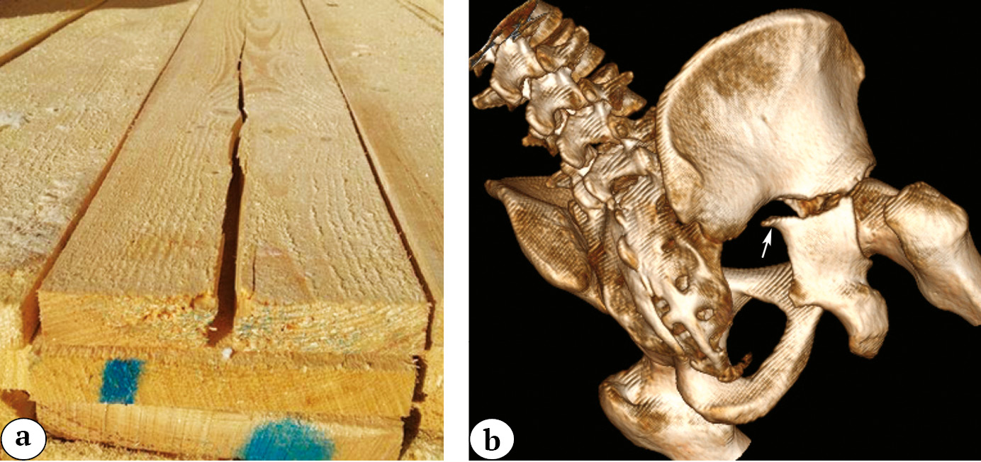 Fig. 13. Splitting of wood along fibers (a); splitting of the iliac bone along calcar trabeculae with formation of a sharp calcar spike (b)