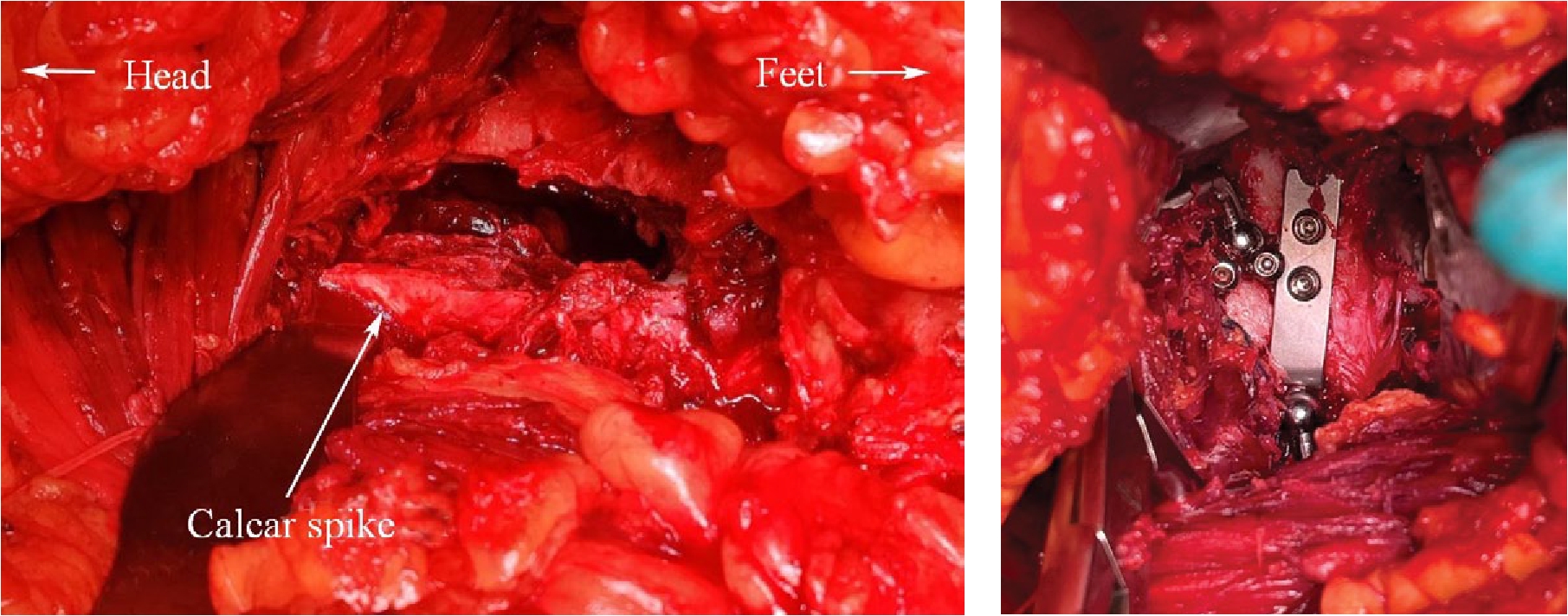 For surgeons with sufficient experience and specialized instruments, it is possible to carefully dissect the calcar spike from soft tissues and perform open reduction using the “palisade technique” with the use of J. Matta’s forceps [17]. Thanks to the high bone density in the calcar region, the fragment does not split even under substantial repositioning forces (Fig. 15).