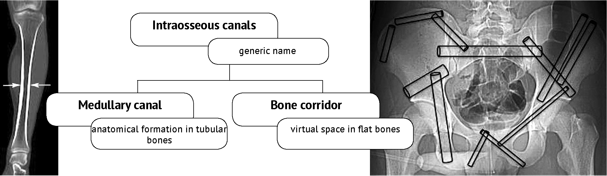– in flat pelvic bones, the concept of the «bone corridor» should be emphasized, which is a species notion related to the term «intramedullary canal» and essentially represents a virtual space with geometry dependent on the implant’s shape.