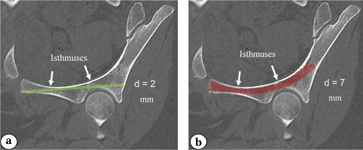 With the advent of the method of fixation of long bone fractures with interlocking nails, assessment of the anatomy of the intraosseous canal (its size, localization of narrowing (isthmus), etc.) has become an important parameter for the correct choice of fixator and successful intramedullary osteosynthesis. The intraosseous canal of long bones is a natural anatomical cavity that is limited by a diaphyseal bone tube filled with bone marrow or fat and is called the “medullary canal”. The isthmus is the narrowest part of the bone canal. The inner surface of the isthmus of tubular bones can be visualized in the form of an “hourglass” (a single-cavity hyperboloid).