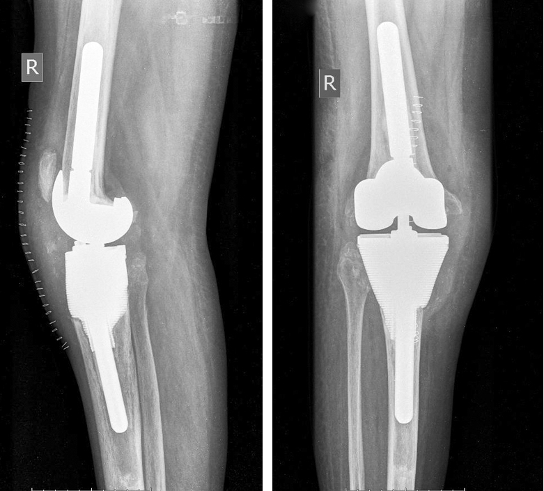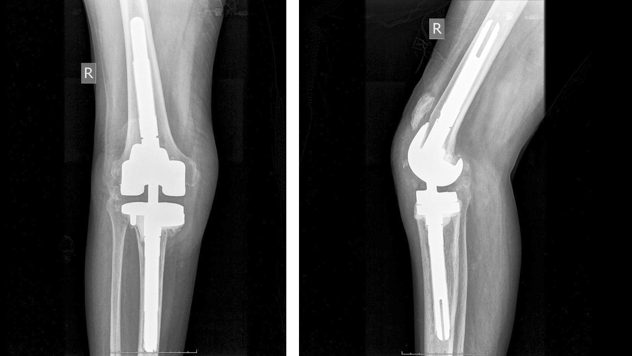 Пациентка 66 лет. В возрасте 39 лет ей был поставлен диагноз «ревматоидный артрит» (серонегативный II ст., активность II, НФ III). На постоянной основе принимает цитостатический препарат из группы антиметаболитов. Проходила курсы консервативного лечения без положительного эффекта. В возрасте 58 лет по поводу вторичного гонартроза 3 ст. последовательно, с интервалом в 2 года, пациентке выполнено тотальное эндопротезирование коленных суставов (левого — в 2012 г., правого — в 2014 г.). Функция левого коленного сустава восстановилась.