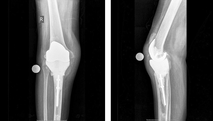 Рис. 6. Послеоперационные рентгенограммы коленного сустава в прямой и боковой проекциях с индивидуальным титановым аугментом