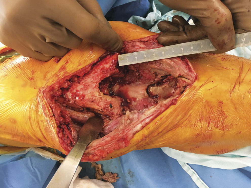 Оперативное вмешательство выполнялось под спинальной анестезией в положении пациентки лежа на спине. Из переднего доступа по старому послеоперационному рубцу была выполнена артротомия правого коленного сустава, выделилось около 20 мл желтоватой синовиальной жидкости, которая была взята для микробиологического исследования. Также произведен забор фрагментов тканей из пяти различных участков для исследования в бактериологической лаборатории. Затем были удалены компоненты цементного спейсера. В связи с тем, что мягкие ткани коленного сустава имели выраженные рубцовые изменения, с трудом был выполнен доступ к суставным концам бедренной и большеберцовой костей. Из доступных отделов удалена синовиальная оболочка, осуществлены краевая моделирующая резекция и денервация надколенника. Проксимальный отдел большеберцовой кости практически отсутствовал до диафиза на протяжении 6–7 см от верхушки головки малоберцовой кости, что делало его неопороспособным для установки стандартного варианта ревизионного эндопротеза (рис. 4).