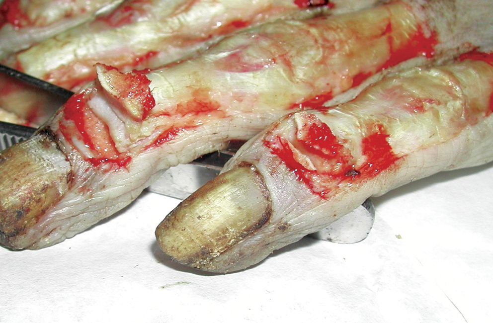 Нас заинтересовал тот факт, что W. Busch и его помощникам не удалось воспроизвести эксперимент P. Segond на трупах и смоделировать «mallet fracture». Дело в том, что несколько лет назад мы проводили исследования, связанные с лечением “mallet finger”, частью которых были испытания на трупных кистях. На кисти трупа мужчины, умершего в возрасте 68 лет, моделировалось повреждение “mallet fracture”. Для удержания фаланг пальцев кисти мы использовали отгибатели для гипсовой повязки типа Вольфа. На всех пяти пальцах удалось смоделировать обсуждаемое повреждение — “mallet fracture”. Фактически мы повторили испытания P. Segond и посчитали уместным представить фото кисти с результатом нашего эксперимента (рис. 1).