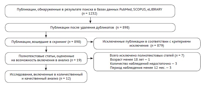 После детального изучения часть полнотекстовых статей была исключена из исследования: в 3 публикациях количество случаев было менее 10 [19, 20, 21], в одной публикации наблюдались пациенты в возрасте менее 18 лет [22], в трех статьях срок наблюдения был менее 12 мес. [23, 24, 25]. В конечном итоге в систематический обзор было включено 12 публикаций (табл. 1).