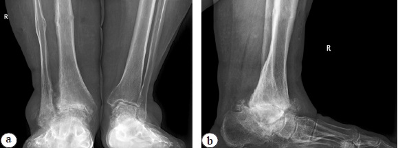 Fig. 2. X-rays of the ankle joints: a — AP X-ray: posttraumatic degenerative distal tibial diastasis, suspicion of gross valgus deformity of the ankle area, 3 stage of posttraumatic deforming osteoarthritis of the ankle joint; b — X-ray in lateral projection: collapse of the talus body, arch of the foot, 3 stage of deforming osteoarthritis of the ankle, talonavicular joint, ankylosis of the subtalar joint