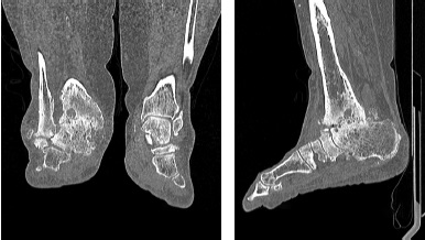 Fig. 3. MSCT of the ankle joints. Right-sided 3 stage osteoarthritis of the ankle joint. The right ankle joint is deformed. Articular surfaces are clear, uneven, subchondral osteoarthritis of articular surfaces with cyst-like rearrangement. The articular gap is threadlike narrowed. Outcome of posttraumatic aseptic necrosis of the right talus