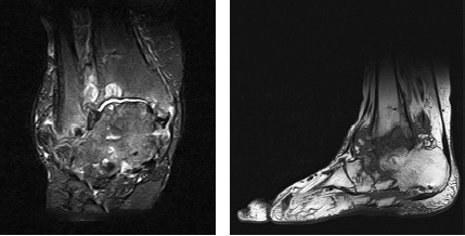 Fig. 4. MRI of the ankle joint. Pronounced swelling of the spongy substance of the talus body, multiple bone cysts of the posterior part of the foot, pronounced paraarticular inflammatory reaction of tissues