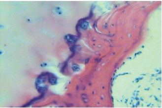 Fig. 5. The necrosis of the talus block: destruction of the basophilic line, introduction of the necrosis process into cartilage tissue. Stained with hematoxylin and eosin. Mag. ×200