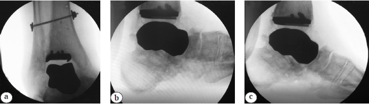 Fig. 7. Control X-rays of the ankle joint 20 months after surgery: a — AP plane, good position of hardware is noted, preservation of the ankle contours; b, c — functional X-rays in the lateral plane of the plantar and dorsal flexion: good position of the endoprosthesis components is noted, total ROM is 28°