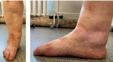 A 64-year-old woman with complaints of pain and deformity of the posterior part of the right foot, lameness applied to the orthopedics clinic of the NIITO named after Ya.L. Tsivyan. In 2008, for a Maisonneuve fracture, the patient received conservative treatment with poor results. In this regard, in 2009, she underwent an attempt of arthrodesis of the posterior part of the foot in an external fixation device, which was unsuccessful. After 5 years, there was a sharp deterioration in the condition, increased swelling, pain, rapid progression of foot deformity (Fig. 1).