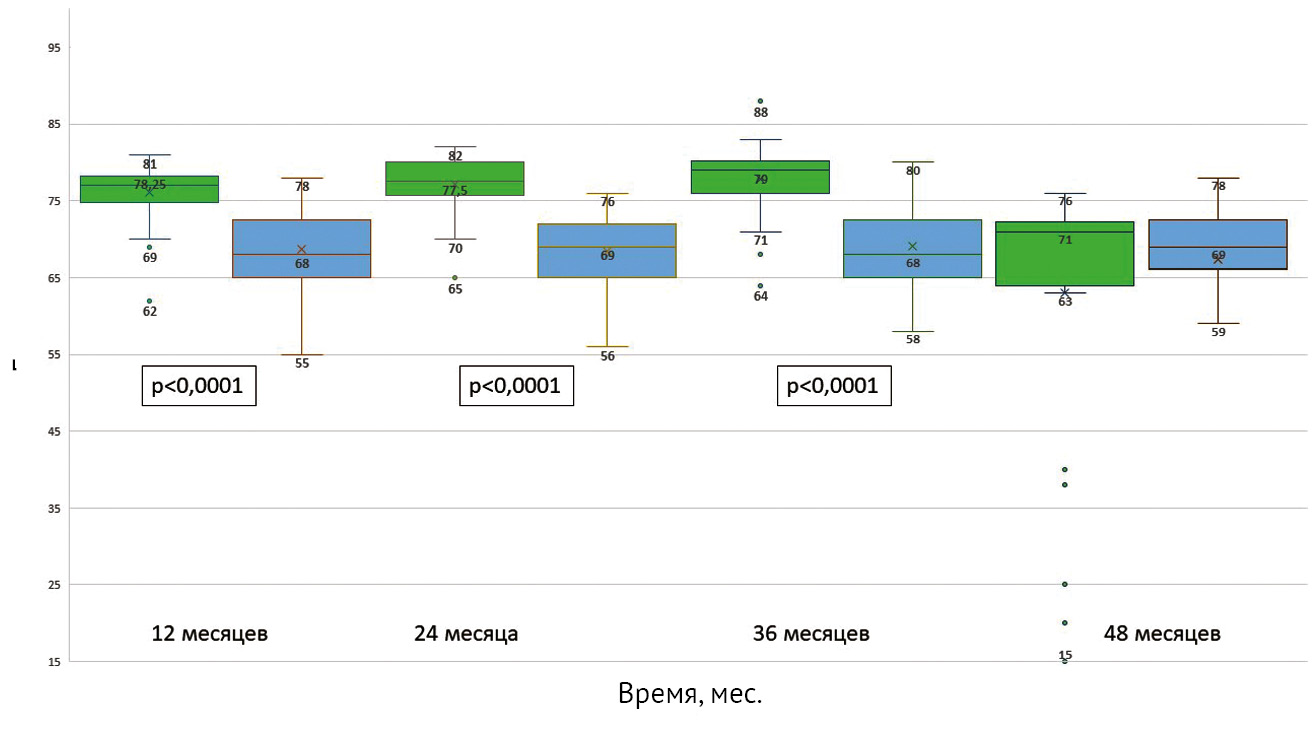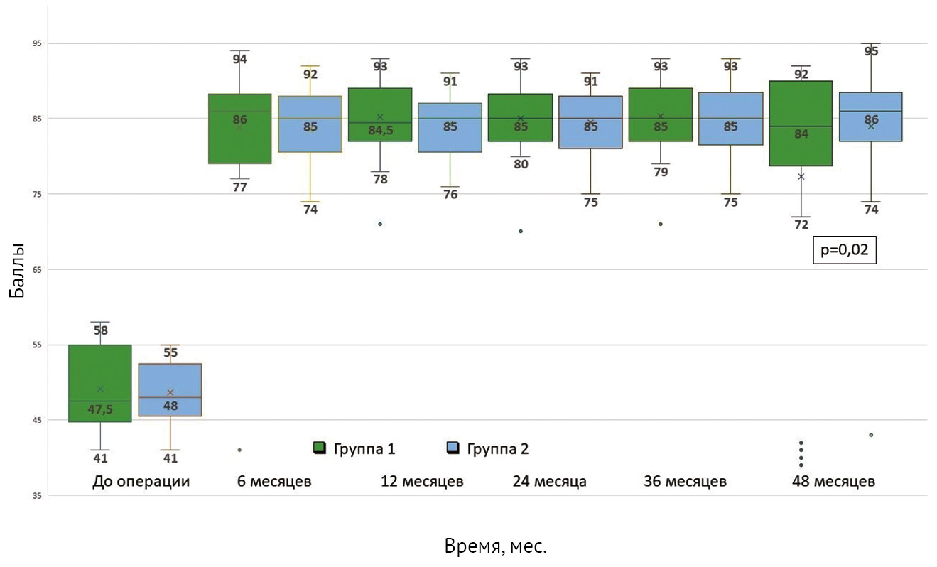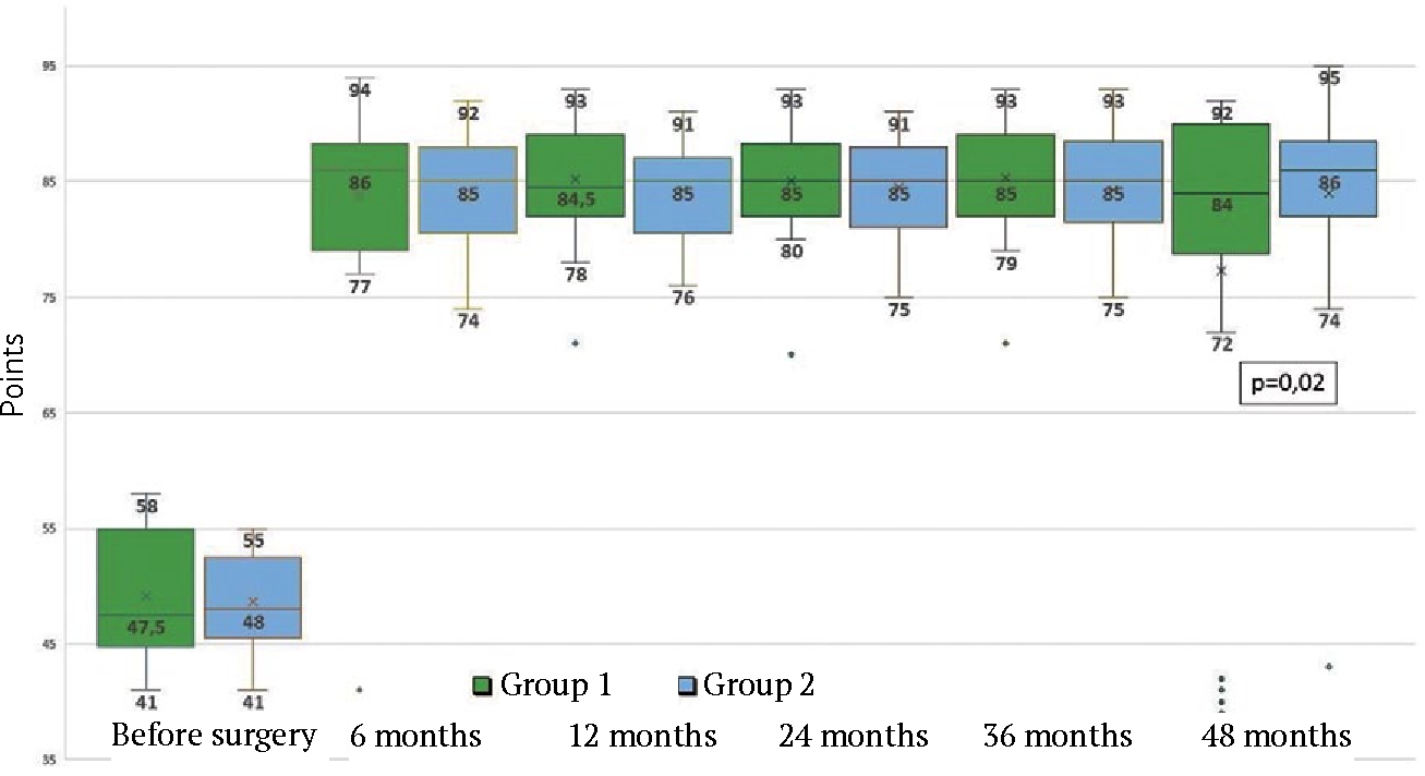 Functional results based on the KSS Function Score did not statistically differ between the groups in the preoperative period and averaged 48 points (Fig. 1). At 6, 12, 24, and 36 months after surgery, no statistically significant difference in KSS Function Score was observed between the groups. However, by the fourth year after primary knee arthroplasty in the group of patients receiving hemodialysis, the average KSS Function Score decreased to 77.3 points, which is likely due to infectious complications in five patients. In Group 2, only one infectious complication occurred 48 months after arthroplasty.