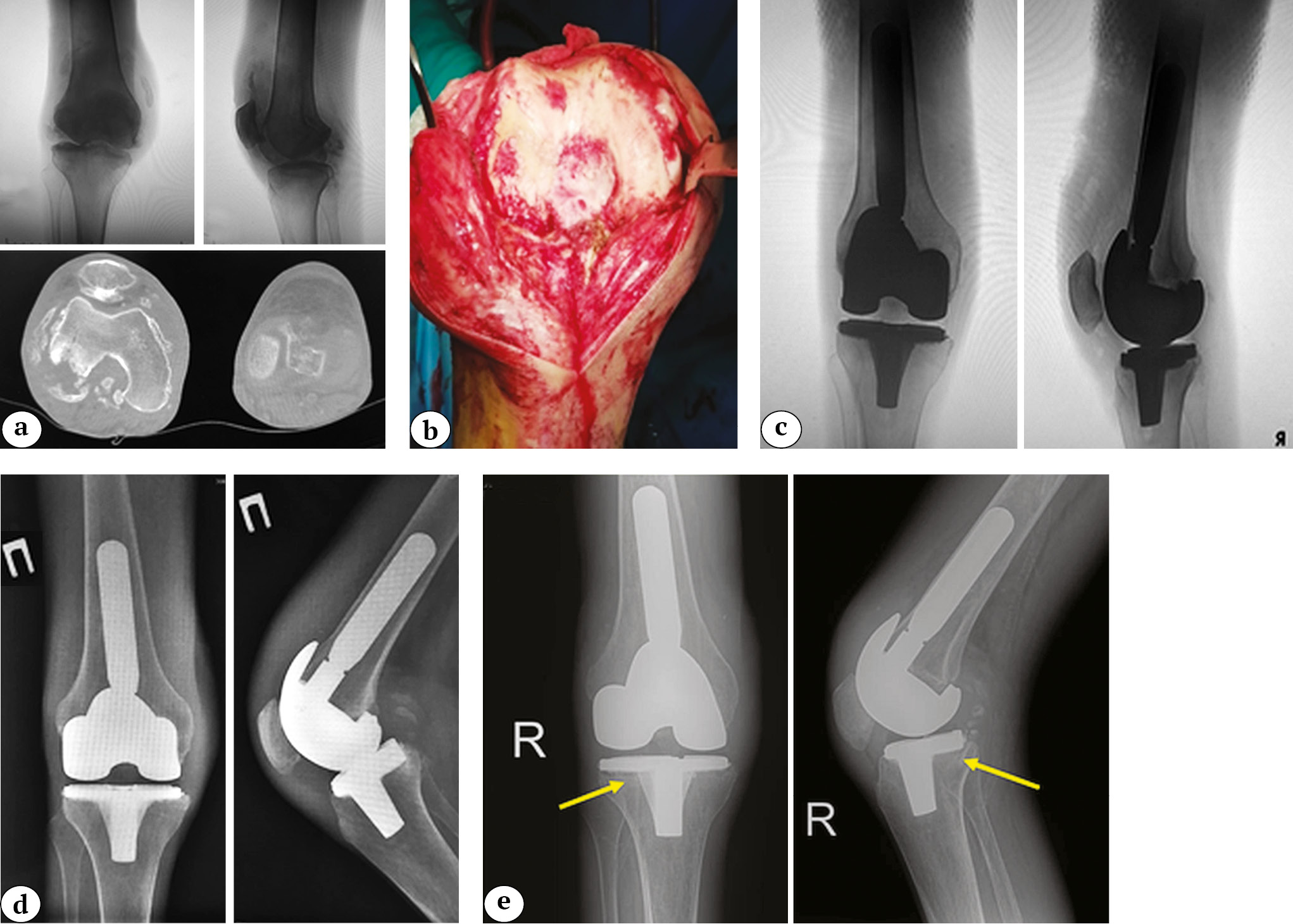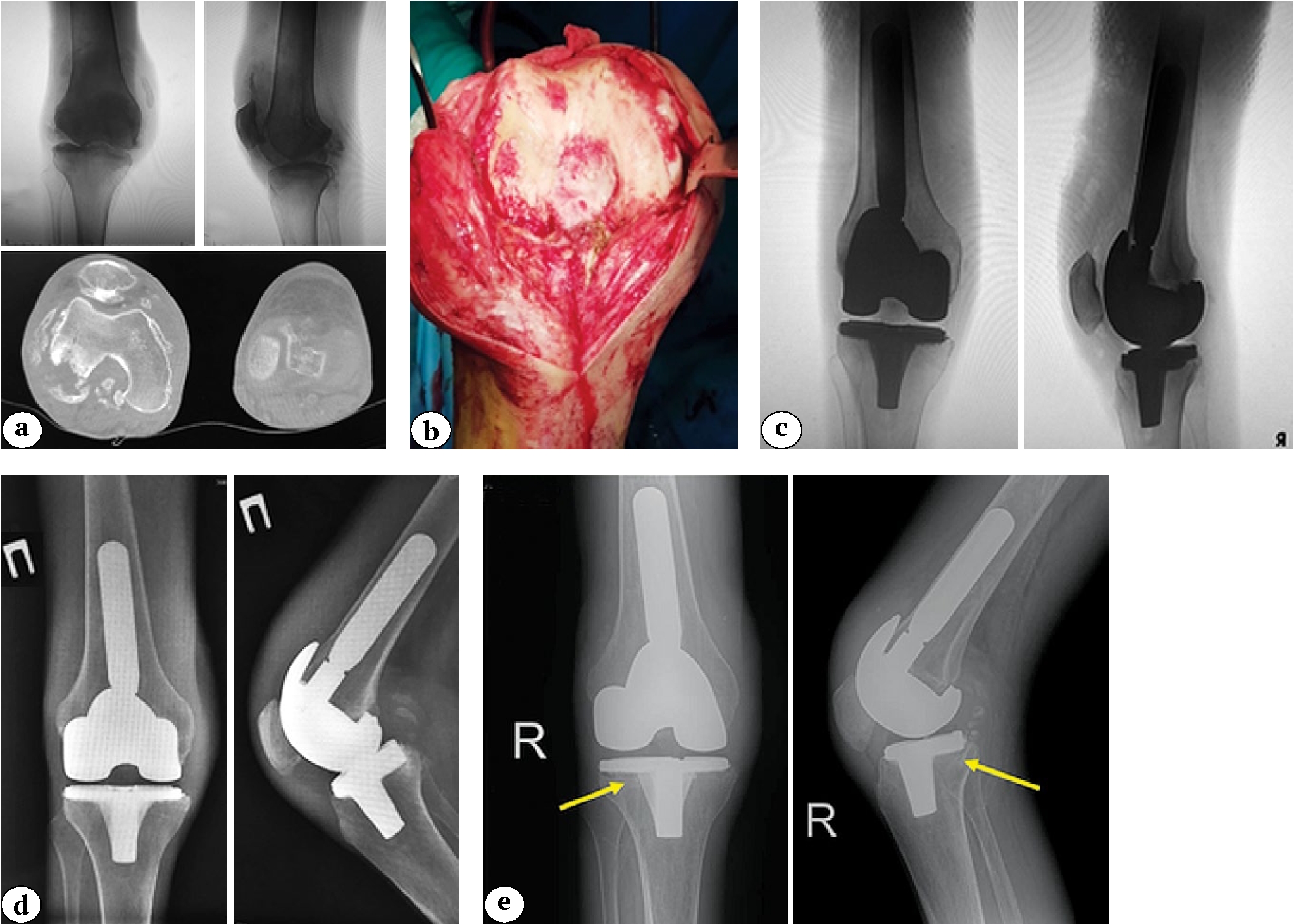Fig. 3 (a, b, c, d, e). A 32-year-old man with secondary osteoarthritis of the right knee. Concomitant diseases: end-stage chronic kidney disease (5D stage), chronic hemodialysis for 7 years, type 1 diabetes: a — X-rays in two projections and CT scans before surgery: a bone defect is detected in the posterolateral part of the lateral femoral condyle b — knee after arthrotomy; c — X-rays after knee replacement (a revision femoral component and a standard 100 mm stem; the bone defect was replaced with two metal blocks of 5 mm and 10 mm, posterior-stabilized insert; standard tibial component); d — X-rays one year after knee replacement: no signs of osteolysis or component instability are observed; e — X-rays of the right knee three years after arthroplasty: radiolucent lines are noted in zones 3, 4, and 2 of the tibial component according to the KRESS (indicated by arrows)