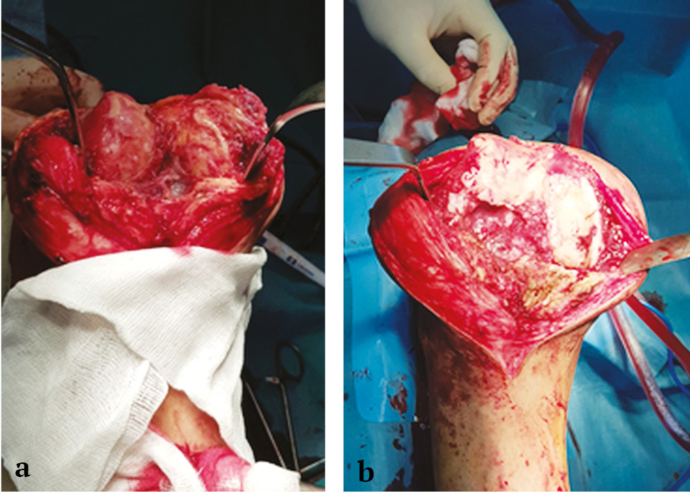 Fig. 4. View of knee joint in patients receiving hemodialysis after arthrotomy: a — inclusions of ß-2 microglobulin amyloid fibrils along the capsule, ligaments, and muscle fibers; b — bone defect of the lateral femoral condyle with adipose tissue and proteinaceous amyloid complexes replacing the bone tissue in the background of chronic inflammation