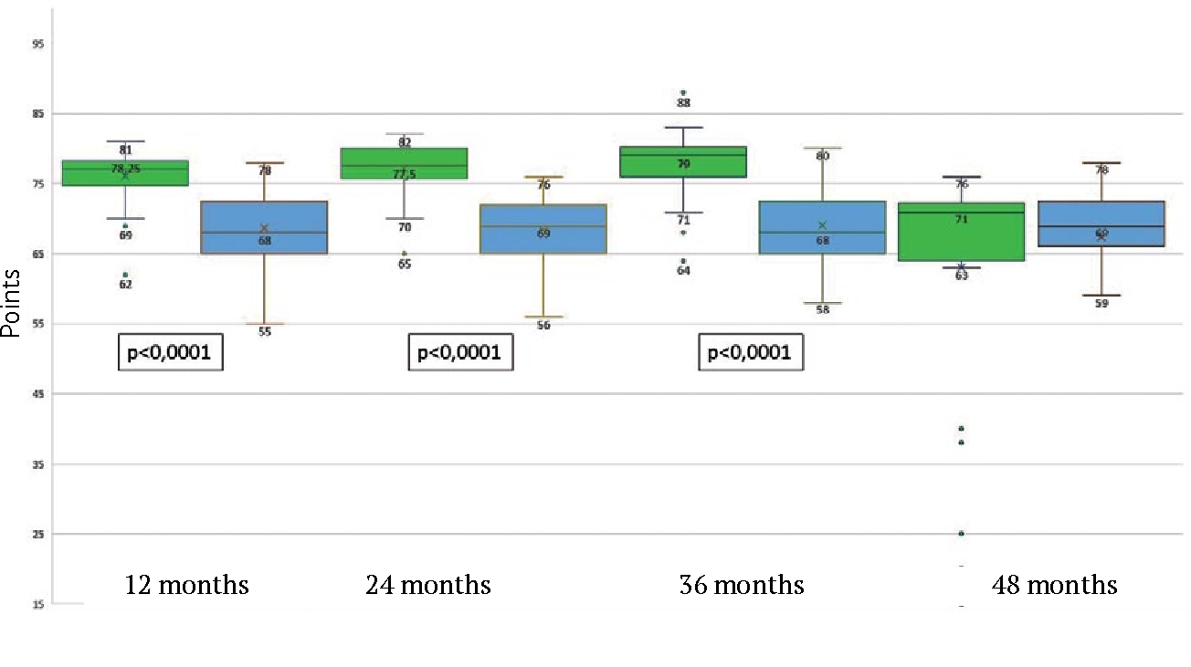 The assessment based on the FJS-12 at 12–36 months after knee replacement in Group 1 patients averaged 77.04 points (SD = 3.9) (Fig. 2). In Group 2 (without terminal kidney pathology), the FJS-12 was lower, averaging 68.72 points (SD = 4.8). A statistically significant difference (p < 0.0001) in FJS-12 results between the study groups was observed in the first three years after knee arthroplasty. However, no difference was observed between the groups after three years, likely due to an increase in complications in Group 1. The better FJS-12 in Group 1 in the early postoperative period are likely associated with the presence of severe forms of polyneuropathy that develop in the late stages of ESKD, resulting in a sharp decrease in pain sensitivity thresholds. Therefore, any improvement in physical and functional status, as well as the condition of the nociceptive system, leads to better FJS-12 in hemodialysis patients.