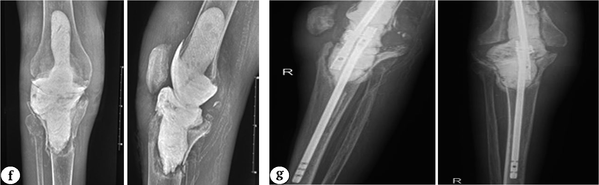 Fig. 3 (f, g). A 32-year-old man with secondary osteoarthritis of the right knee. Concomitant diseases: end-stage chronic kidney disease (5D stage), chronic hemodialysis for 7 years, type 1 diabetes: f — X-rays 3 years and 7 months after knee replacement (an articulating spacer was implanted); g — X-rays 4 years and 2 months after primary knee arthroplasty (an articulating spacer was replaced with a block spacer due to recurrent infection)