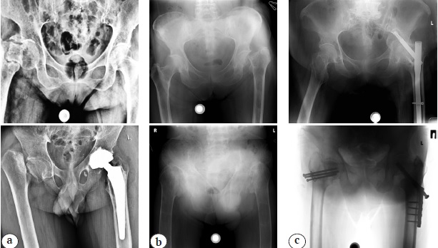 Type C is femoral neck non-union, complicated by the presence of a previously implanted hardware, which led to infection of the hip joint and/or the development of a defect of the acetabulum or proximal femur as a result of its migration.