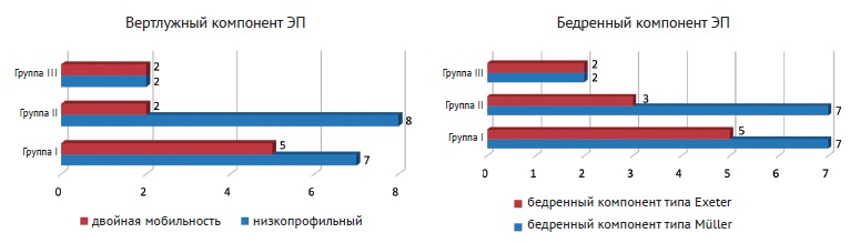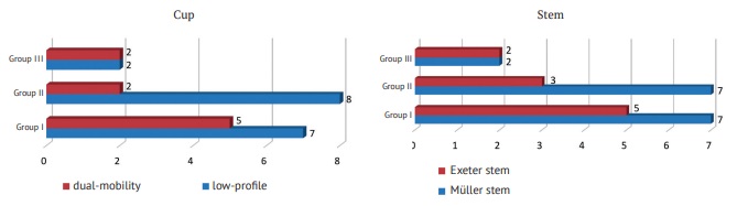 Figure 2 shows the distribution of cement components of hip endoprosthesis in the studied groups of patients. Among the patients of groups I and III, the implanted components were distributed approximately equally. Group II patients were significantly more likely to have low-profile cement acetabular components and femoral components of the Müller type.