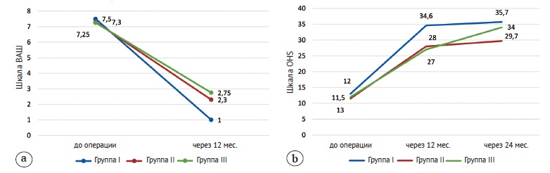 4. Fig. 3. Preoperative and postoperative results assessment in the study groups: a — pain severity according to VAS; b — functional results according to OHS